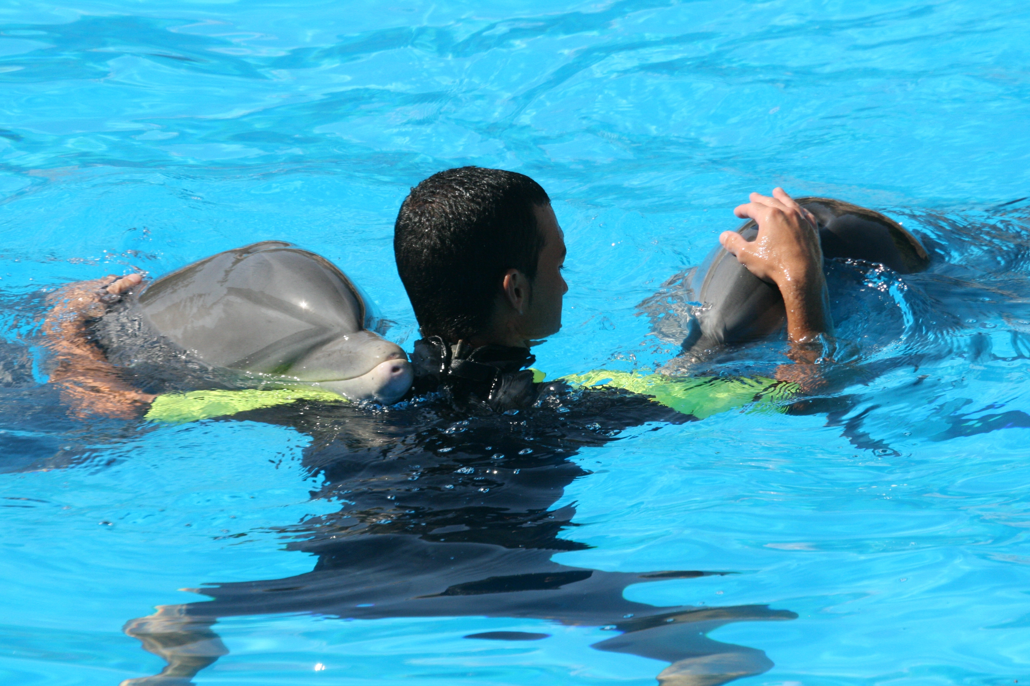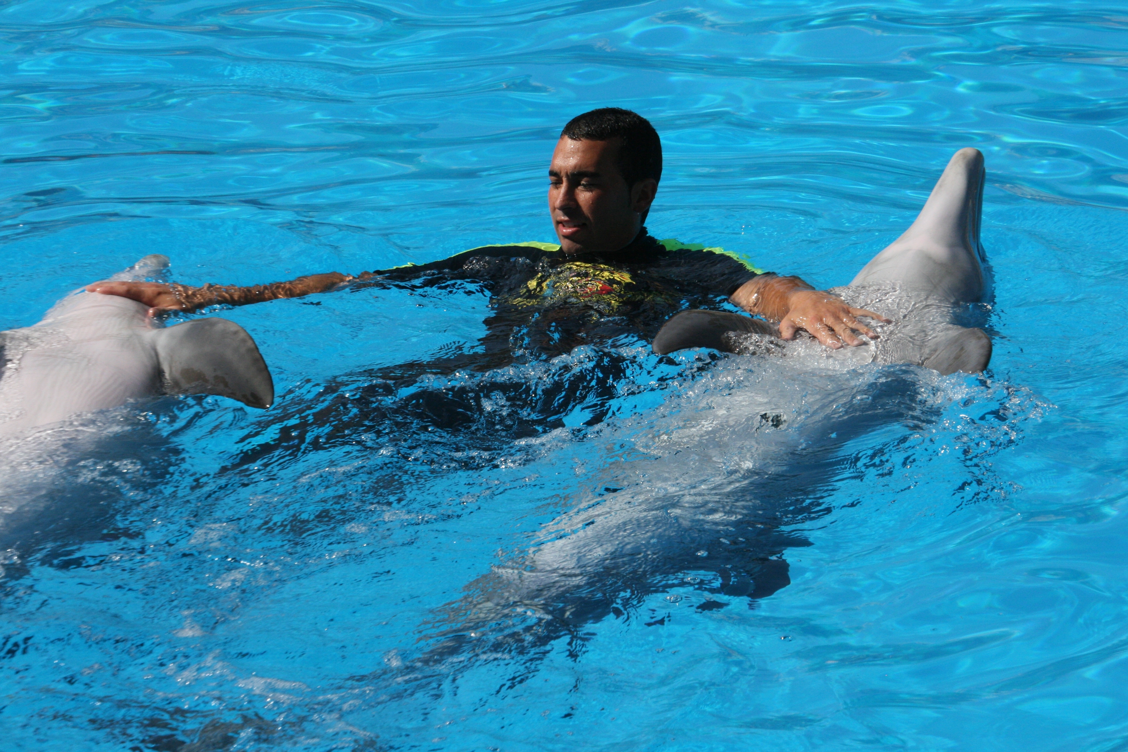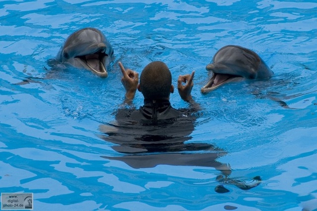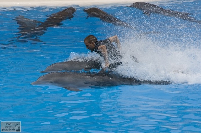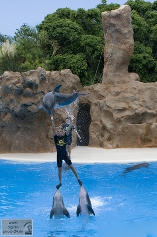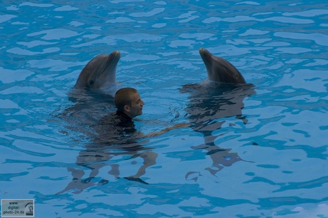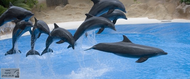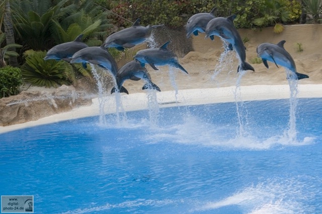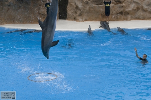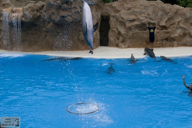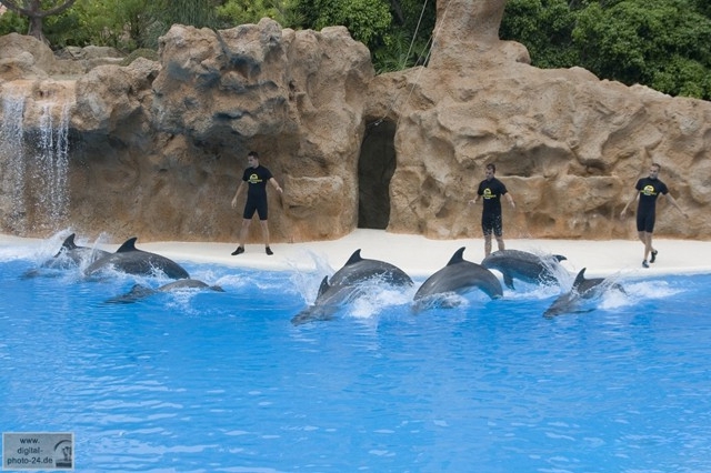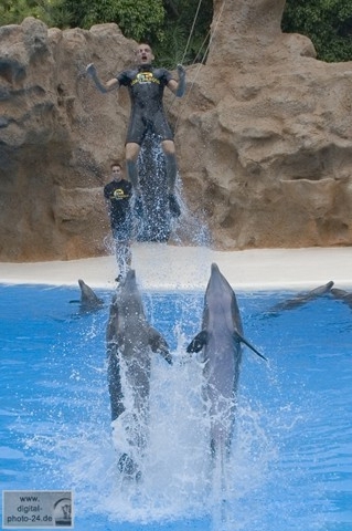 Die Delfine zeigen in der rund zwanzigminütigen Show ein wahres Feuerwerk von Kunststücken: Sie springen durch Reifen, balancieren mit Bällen, schleudern ihre Trainer durch in der Luft hängende Reifen und können sich sogar mit verbundenen Augen orientieren.